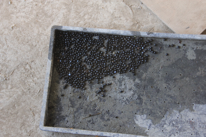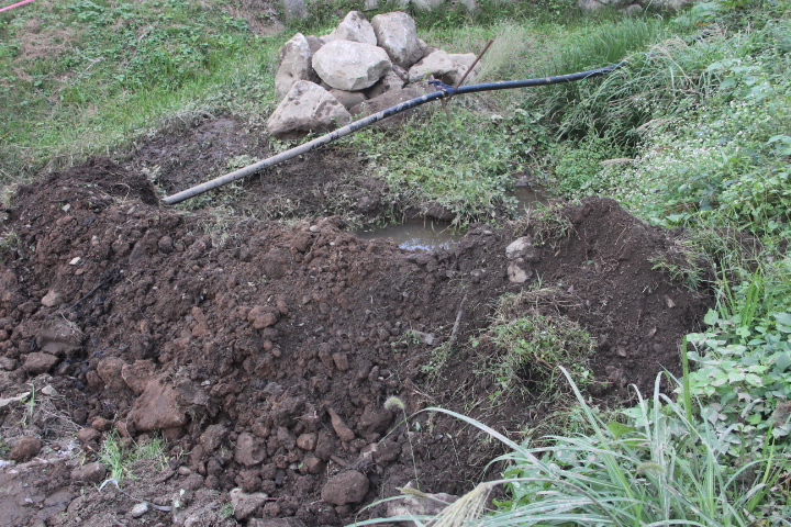 井戸から水を抜き、清掃をする、5回目の水抜きです、上部の水は澄んだが、底部はまだ汚れている、これからも水抜きを繰り返す。
