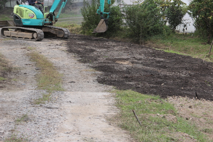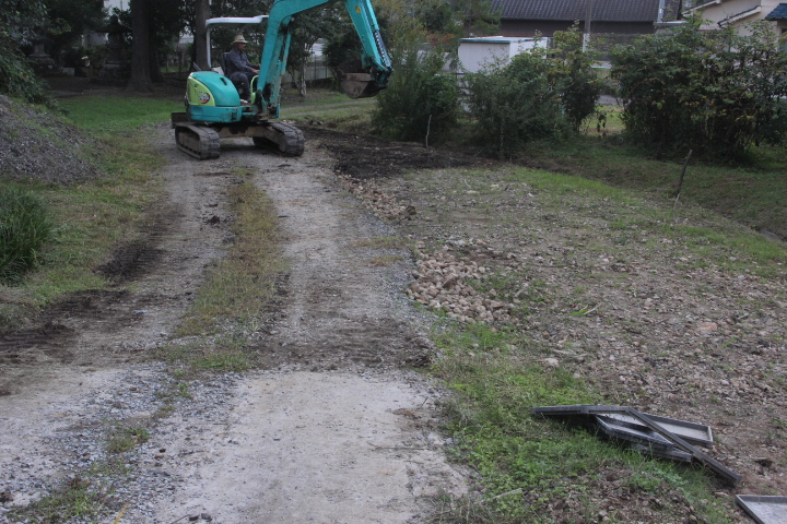 残土を片づけたあと地に砂利を撒き鎮圧する