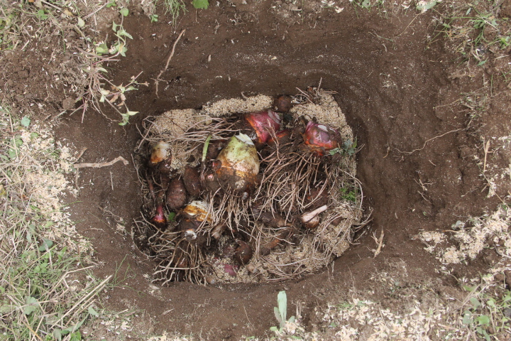 畑に70cmほどの穴を掘り、サトイモの種イモを貯蔵する、穴の下とサトイモの上にモミガラを敷き保温し越冬する。