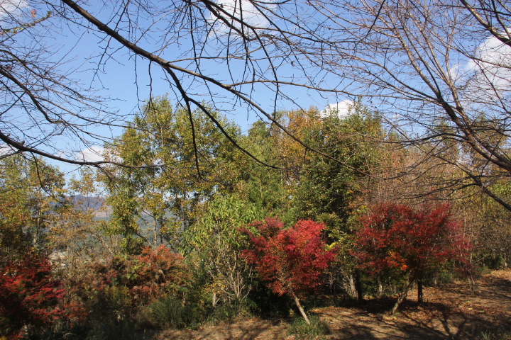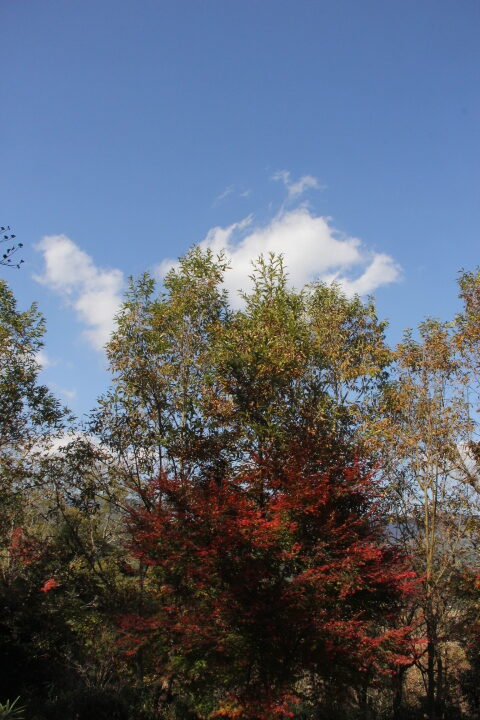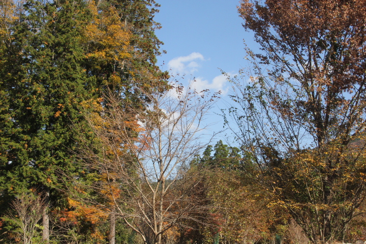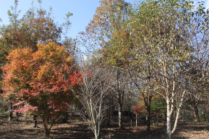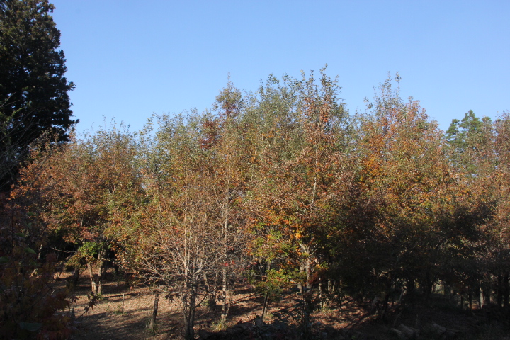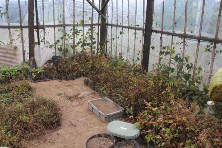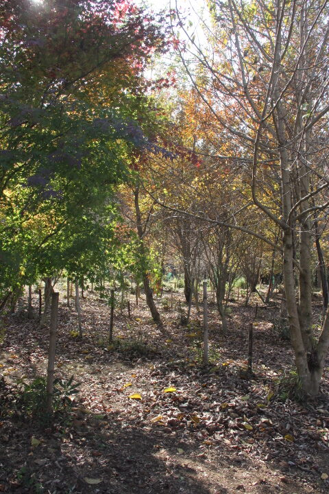 苗の周りに支柱を立て、ネットを被せて鹿の食害を防ぐ、カエデの仲間は鹿の食害が激しく、いまだに植え替えをしている、今回から密植とし、沢山生き残った場合は間引きをする方法に替えた。