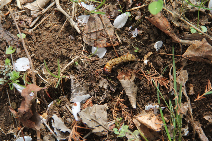 木の葉がしげる前の見通しの良いこの時期に、被害木を見つけ、虫が開けた穴に農薬を注入します、写真はコウモリガの幼虫です、飛び出してくるのはこの虫だけです。