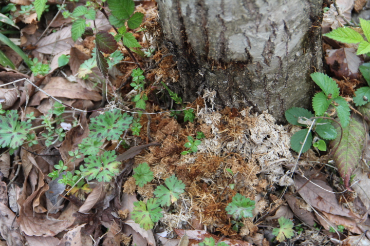 コナラの木の下に虫が出した木くずがある、これをめやすに被害木を見つける、農薬を注入してもこの虫は飛び出してこないので、虫の名前は分からない