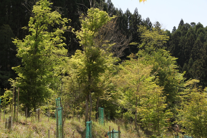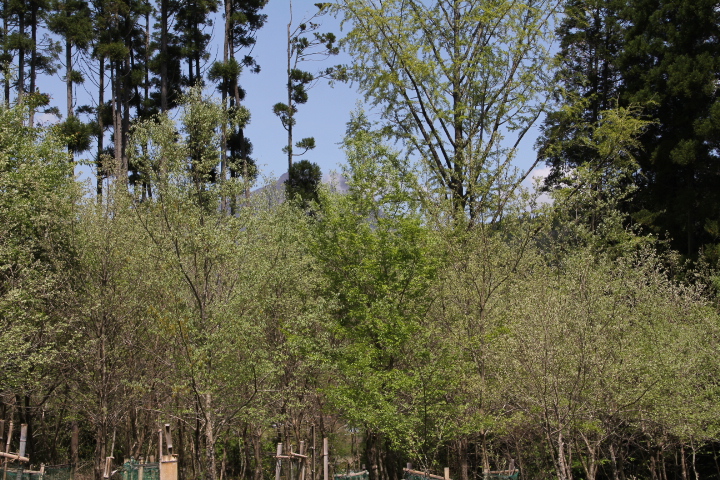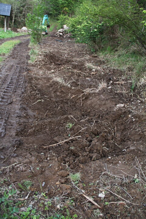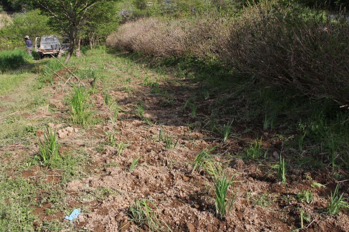 手抜きしてユンボで穴を掘り苗を植えた、深く植え過ぎたようだ、幸い、昨年、余った苗を野積みにしていた、それが冬越し、芽吹いている、この苗を手掘りで植えた。
