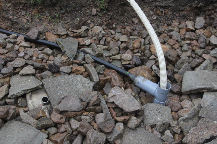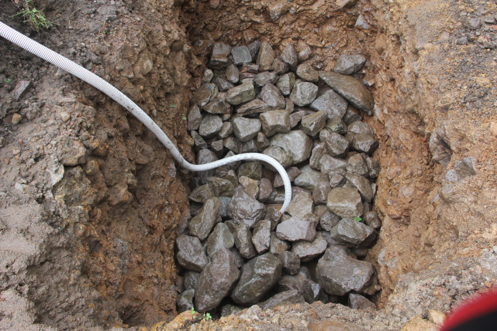 井戸の上面まで石で埋める、オーバーフローする水は黒いパイプで側溝に流す