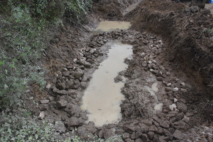 池はひょうたん型とし、側面は石積みで水漏れを防ぐためにコンクリートで石の間を埋める、寒くなりコンクリート作業は不適となり、ここで中断する