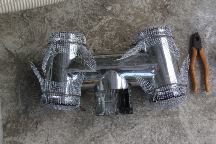 鳥が煙突の中に巣を作るので、侵入防止のネットを被せた